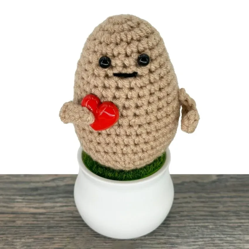 Brighten someone's day with this delightful positive potato crochet in pot. This charming crochet creation features an adorable potato design with a cheerful expression, sitting snugly in a neatly crafted pot with vibrant green accents. It is a unique and meaningful gift that spreads positivity and inspires smiles. Perfect for any occasion, this crochet potato design is an excellent decorative item for desks, shelves, or any space that could use a touch of charm and motivation.