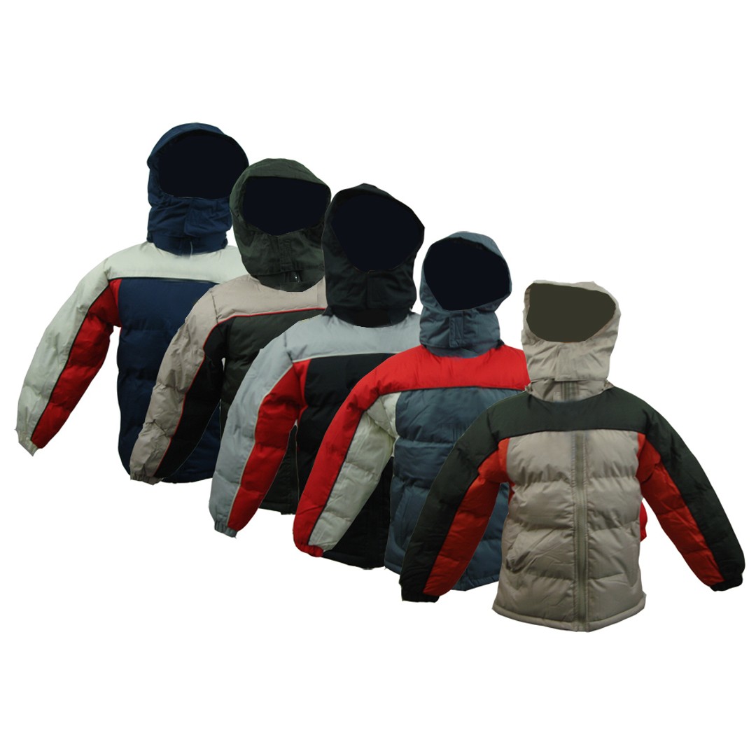 These boys' winter puffer jackets come in assorted multi-color styles with enough diversity to fit anyone's fashion taste. The jackets use 100% polyester and nylon material for high insulation and protection from cold weather.