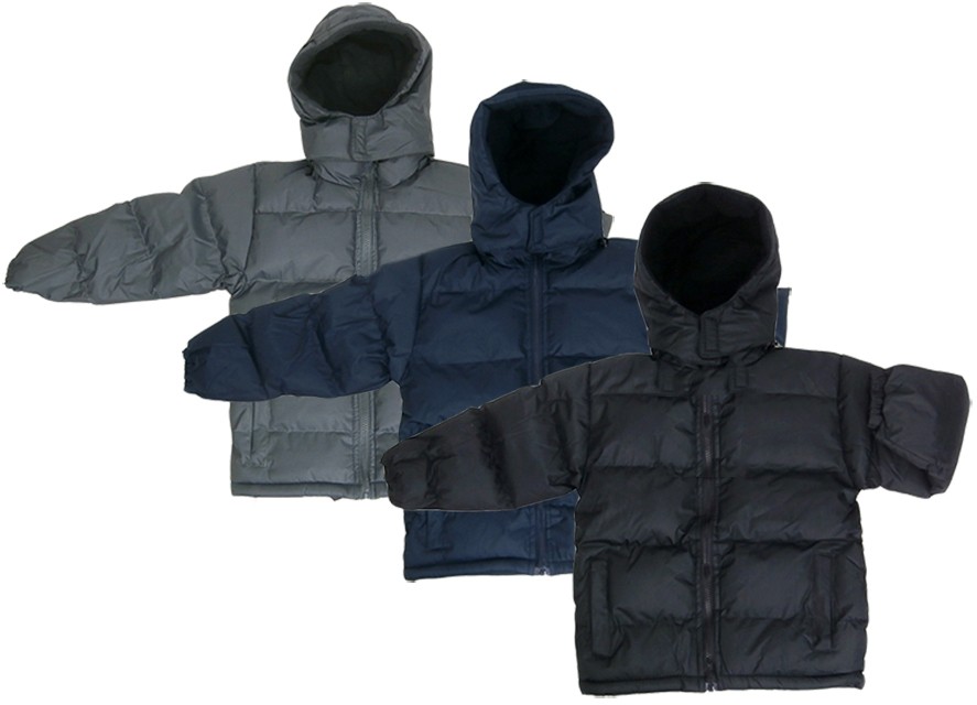 Boys hooded winter jackets offer essential protection for young children during colder months. Designed in navy, grey, and black, these jackets are available in sizes 6 to 24 months to fit a wide age range. The practical hood and insulated