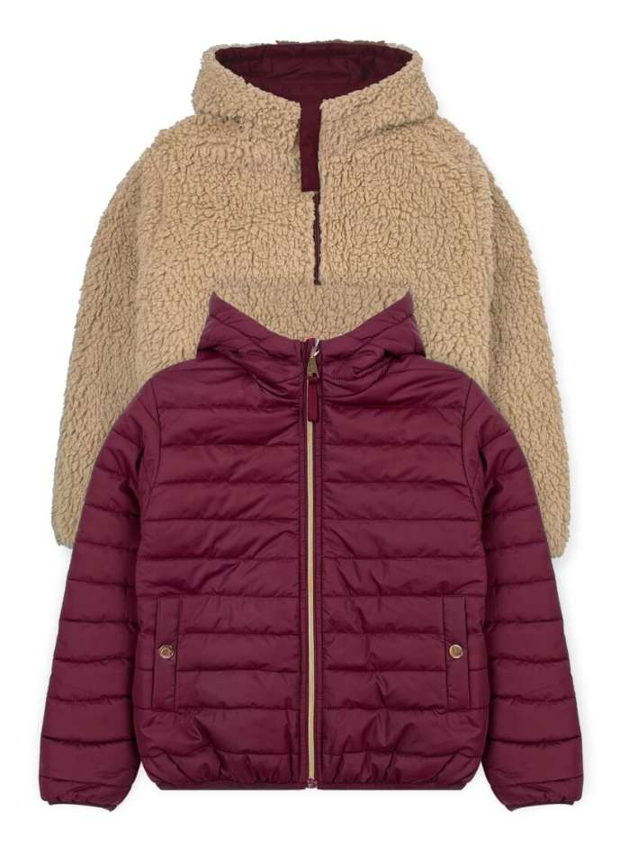 Keep warm during the winter months by shopping wholesale on Girls' Sherpa Lined Reversible Jackets! With the burgundy exterior and tan sherpa lined interior, its stylish for any occasion.