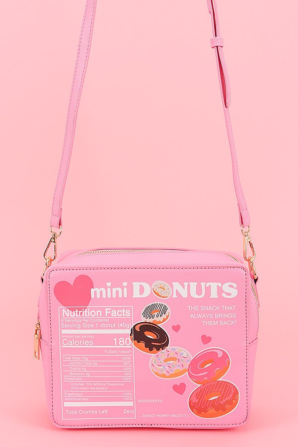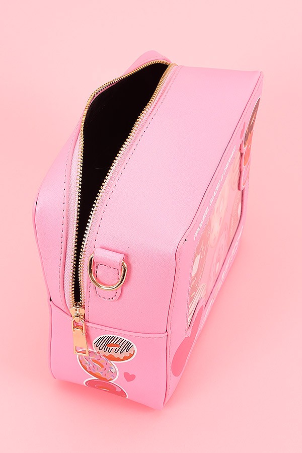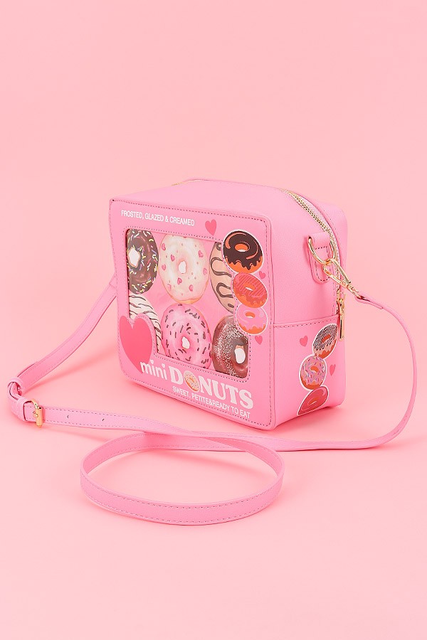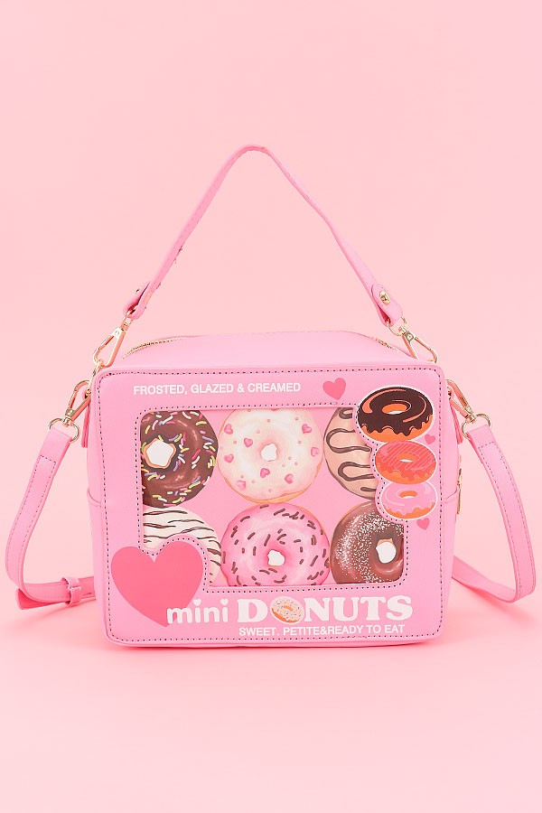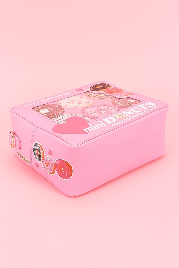 This is a Novelty Bag. Designed in a boxy silhouette, it features a front window panel showcasing vibrant illustrations of various donuts in different styles. The top of the window displays the text "FROSTED, GLAZED & CREAMED" with a small heart icon, while the bottom has "mini DONUTS" and "SWEET, PETITE, READY TO EAT" in a playful font. A large heart shape adorns the lower left corner of the window. The bag comes with a top handle and two adjustable shoulder straps for versatile carrying options, and a zipper closure ensures secure storage. Perfect for casual outings, theme parties, or adding a fun and whimsical touch to everyday outfits.