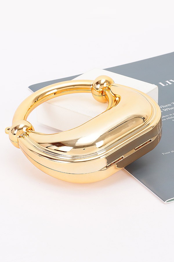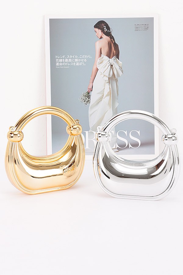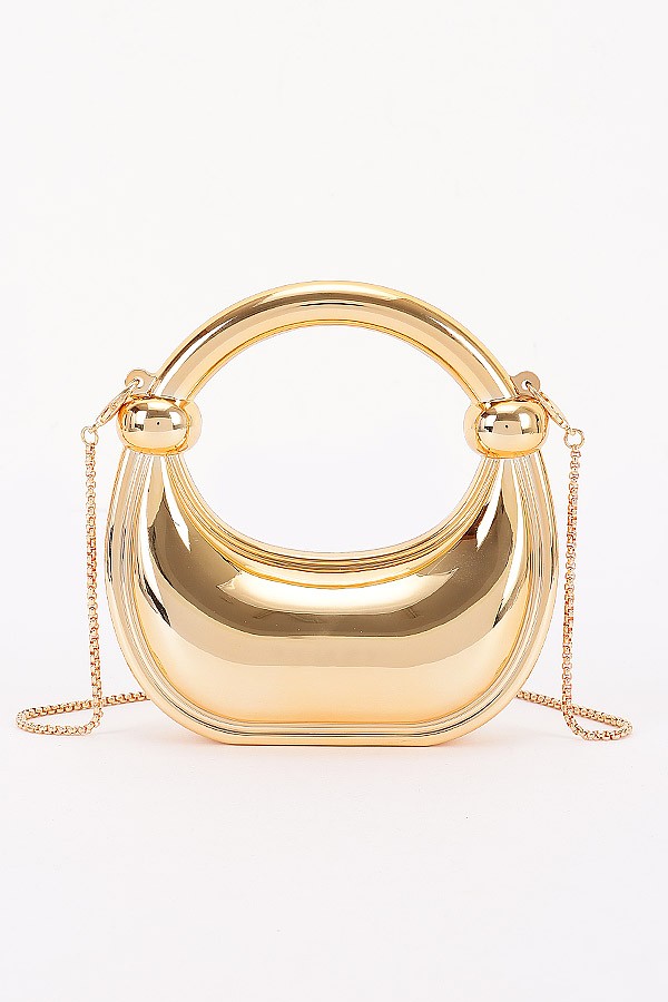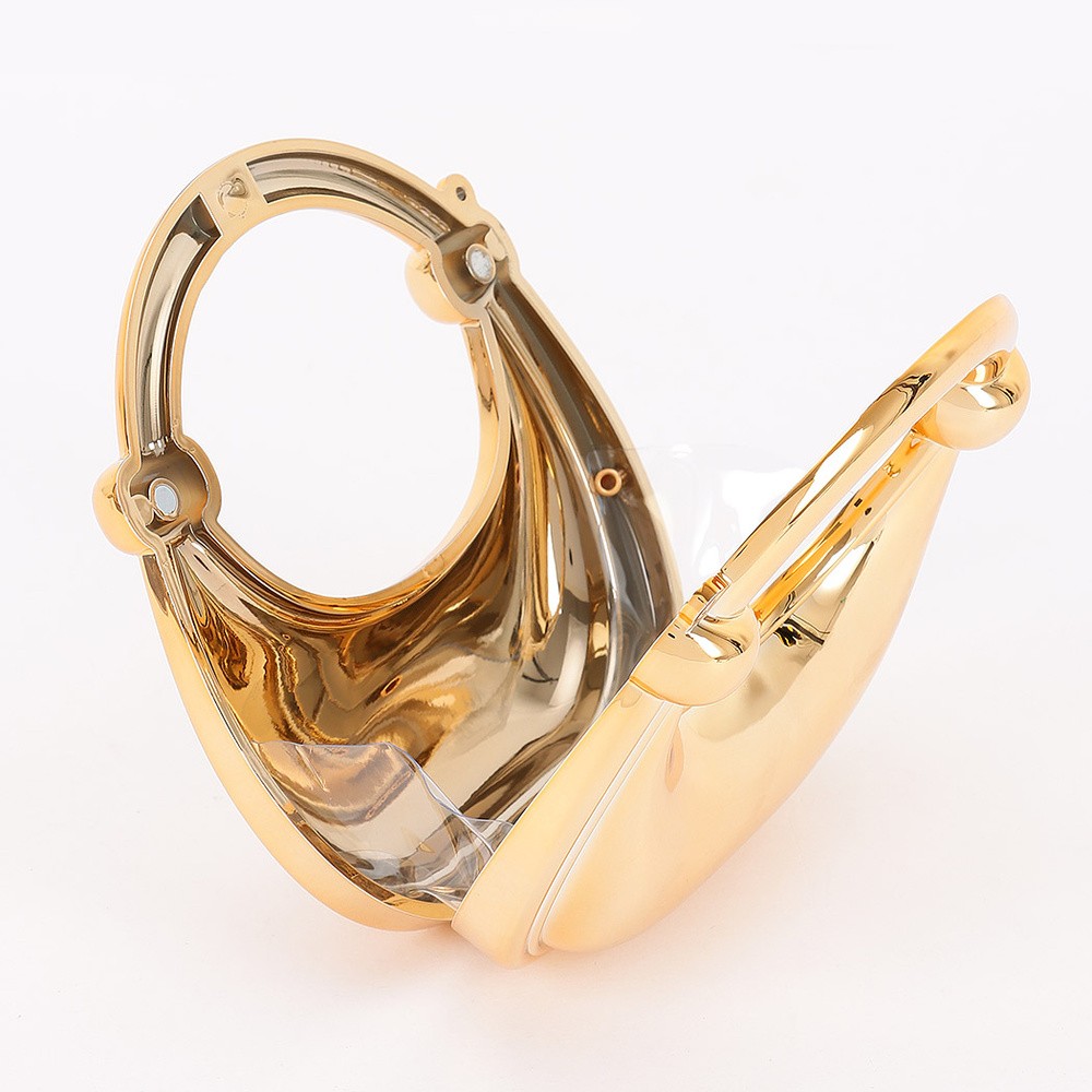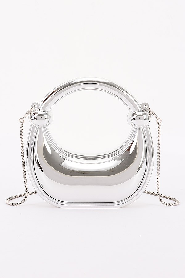 This Acrylic Mini Bag features a sleek, metallic - looking acrylic construction with a unique, curved design. It comes with a chain strap, allowing for versatile carrying options, and has a modern and stylish appearance.