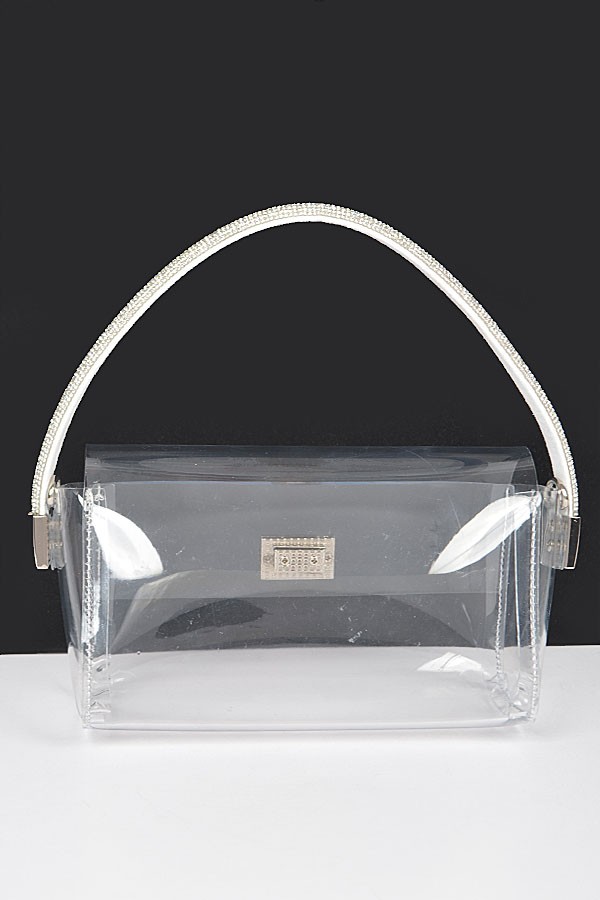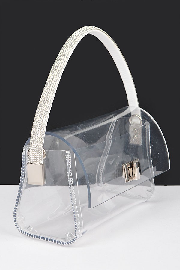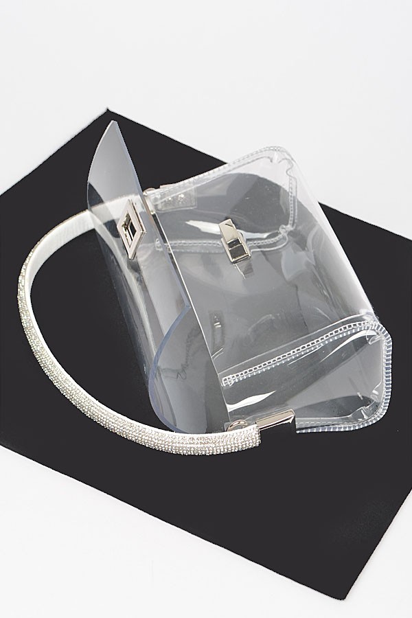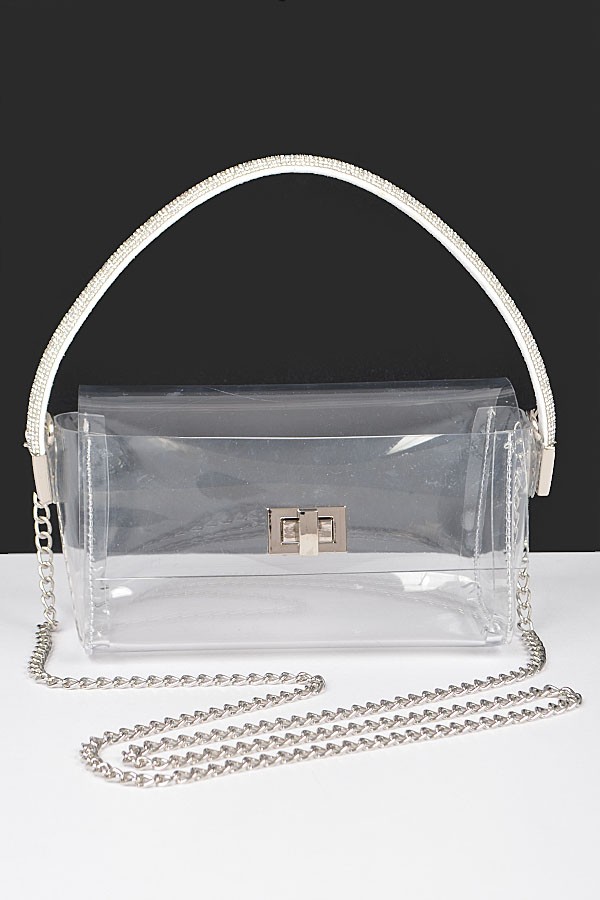 Shine with effortless elegance carrying this Transparent Rhinestone Top Handle Flap Bag. Designed with a clear body adorned in sparkling rhinestones, this bag blends modern glam with classic structure. The sleek top handle and metallic accents elevate its look, making it perfect for evening events, parties, or any outfit that deserves a touch of luxury. A magnetic flap closure keeps your essentials secure while maintaining a chic, polished appearance.